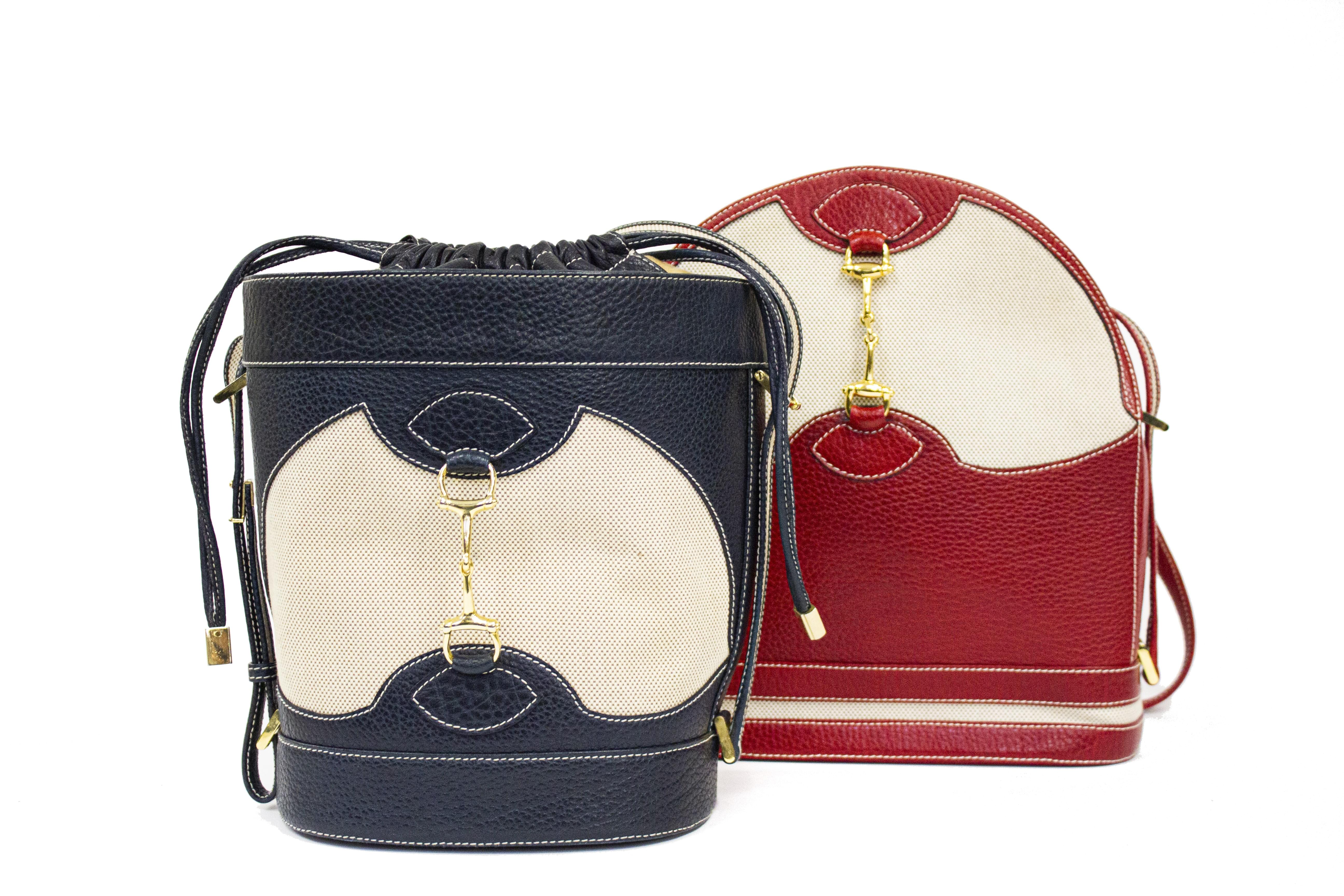 L'un en cuir grainé rouge et tissu beige et l'autre en cuir grainé bleu marine et tissu beige, intérieur en cuir blanc, garniture en métal doré, H 25 et 32 cm