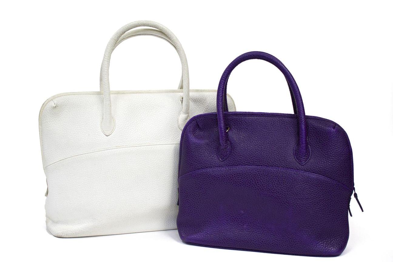 Cuir grainé blanc et violet, intérieur en daim beige, garniture en métal doré, env. 30x37 cm et 25x28 cm