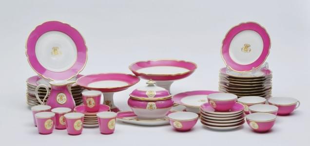 183. Service à dessert à marli rose et monogramme C doré au centre