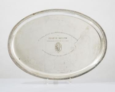 3361. Plateau ovale à bordure de feuilles d'eau, dédicacé "Le Conseil...