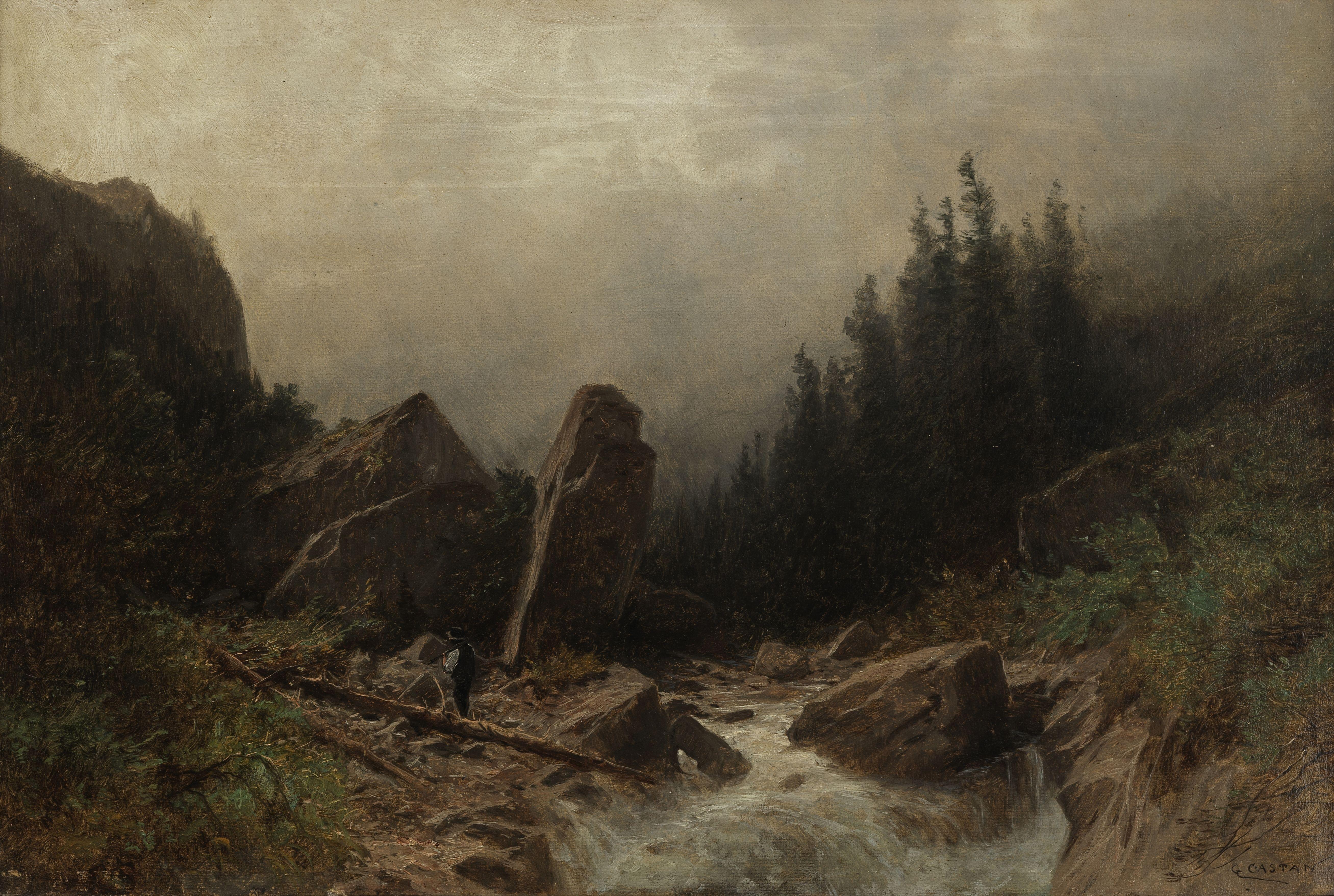 Chasseur au bord d'un torrent dans les Alpes, huile sur panneau, signée, 39x60 cm