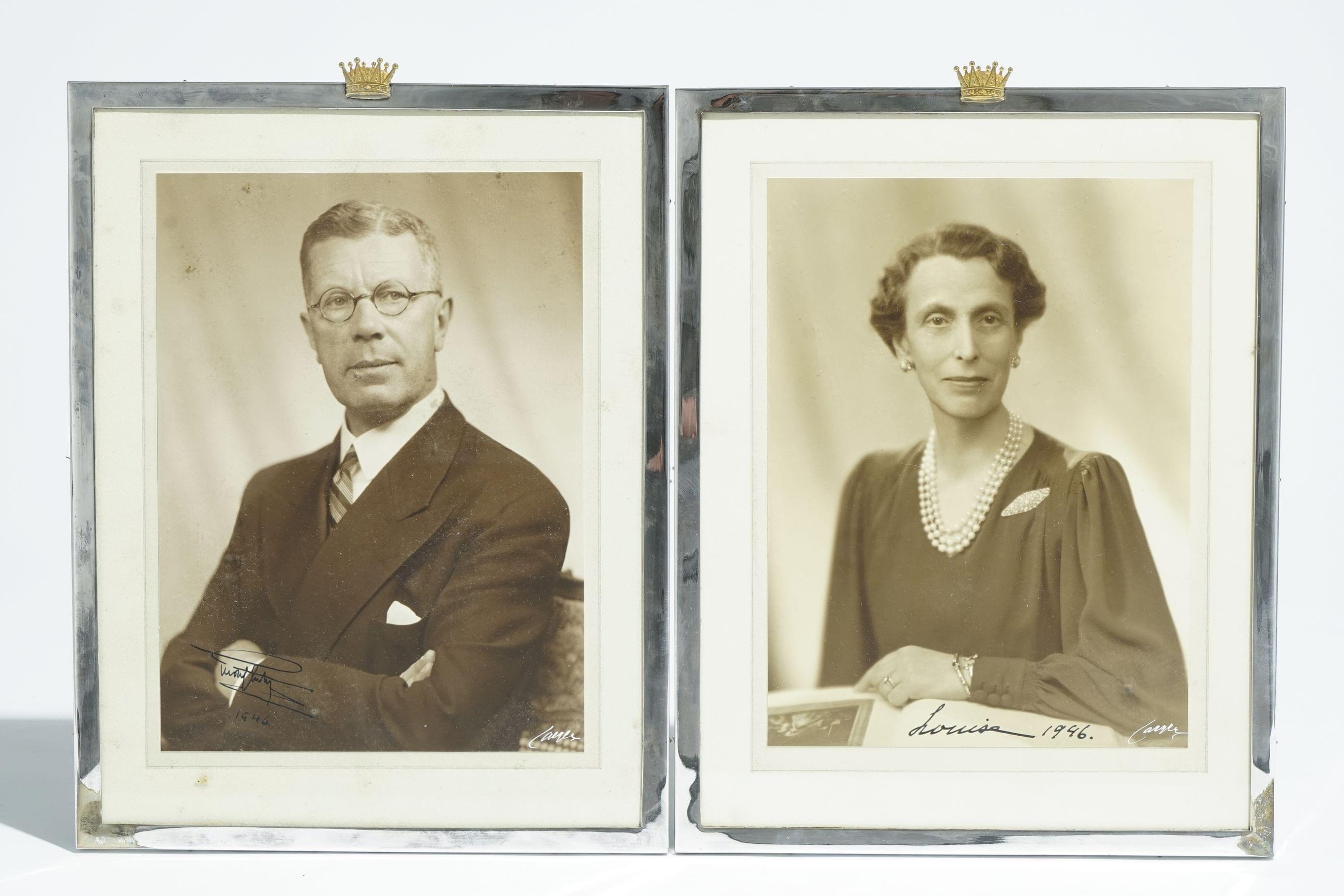 122. Gustave VI Adolphe et Louise de Suède, paire de photographies dans un cadre couronné en argent, Suède, 1946