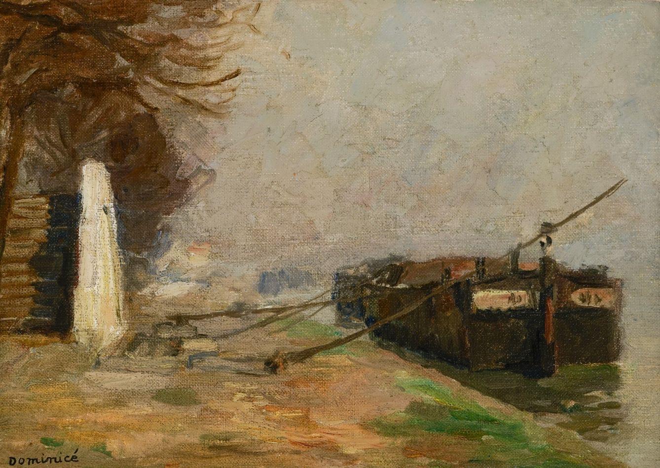 Bateau sur la rive du lac, huile sur toile, signée, 24x33 cm