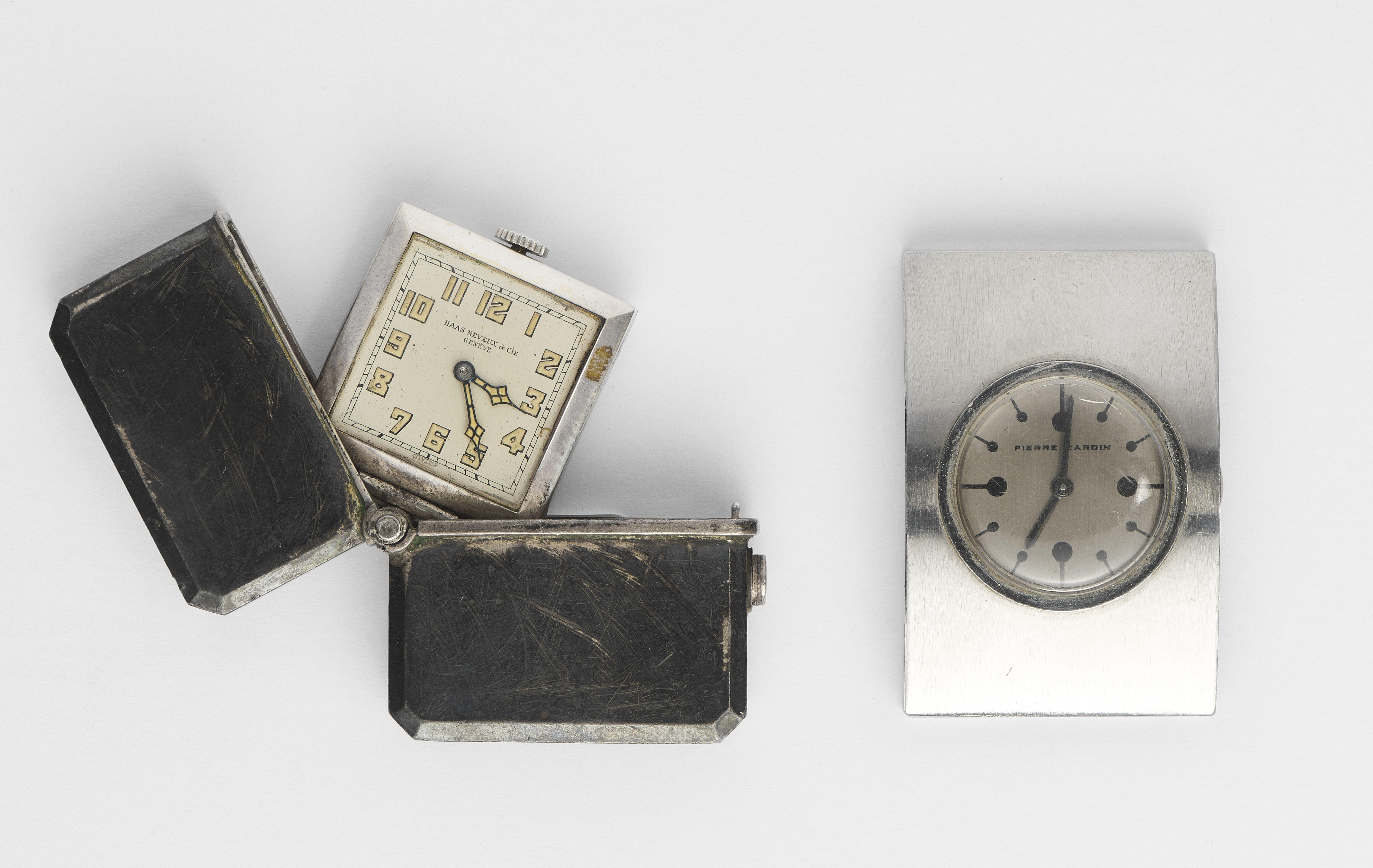 La première à cadran gris, aiguilles bleues et chiffres arabes luminescents, argent 935, 27x27 mm, dans son boîtier, H 43 mm, la seconde sans son bracelet, à cadran gris, aiguilles et index bâtons stylisés noirs, acier, 46x31 mm