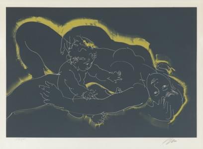 Mère et enfant sur fond noir, lithographie, 54x74 cm