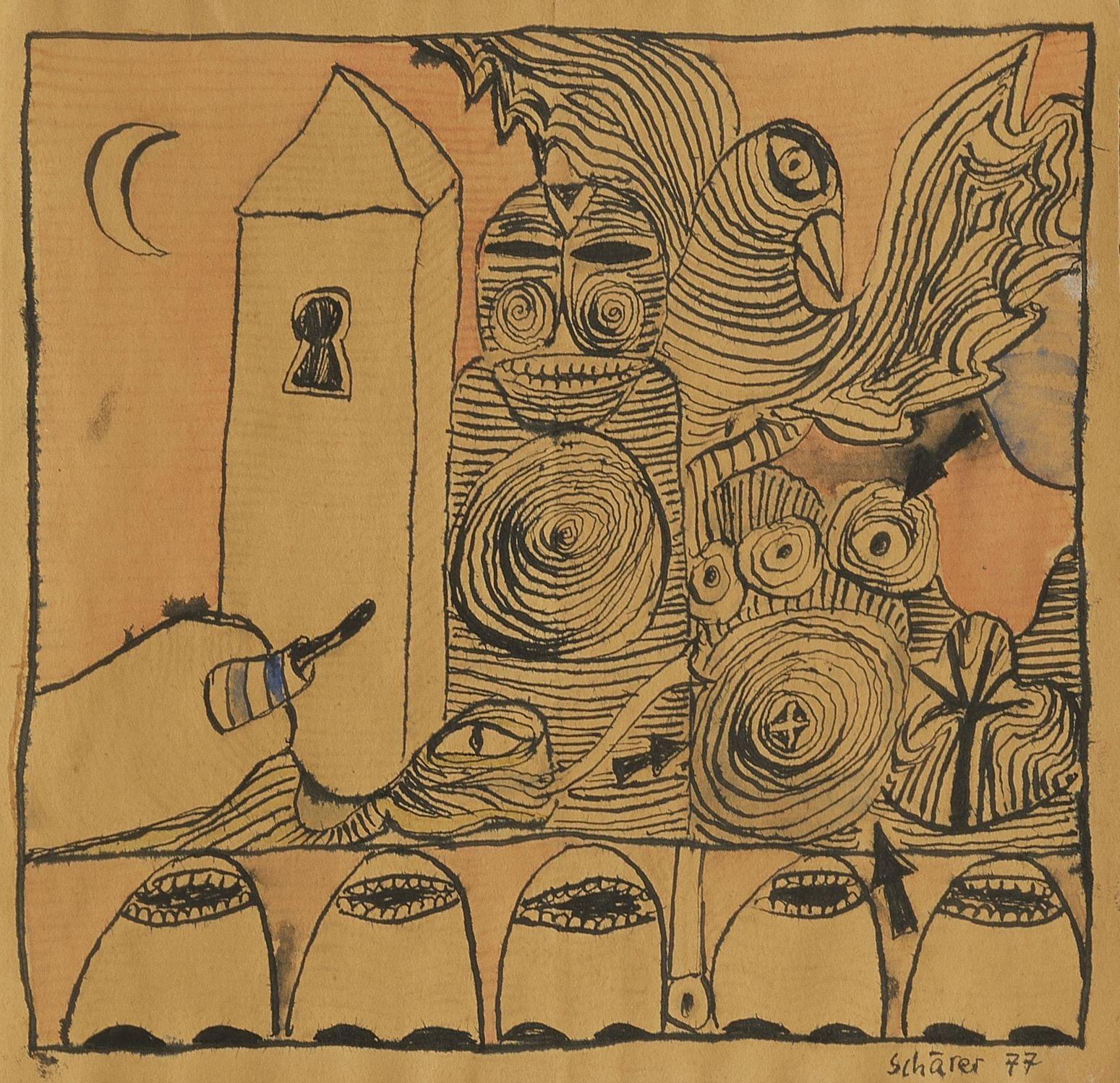 Visage surréaliste, gouache, signée et datée 78, 46x32,5 cm