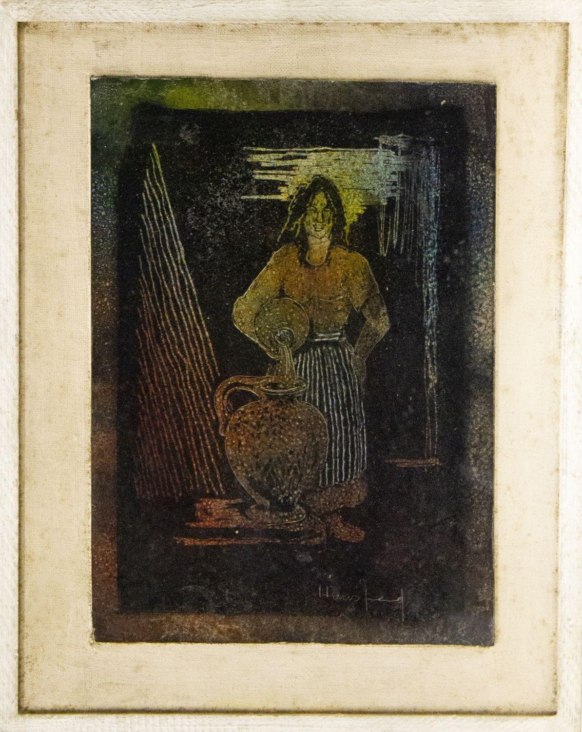 Paysanne, peinture sous-verre, signée et datée 58, 26x20 cm