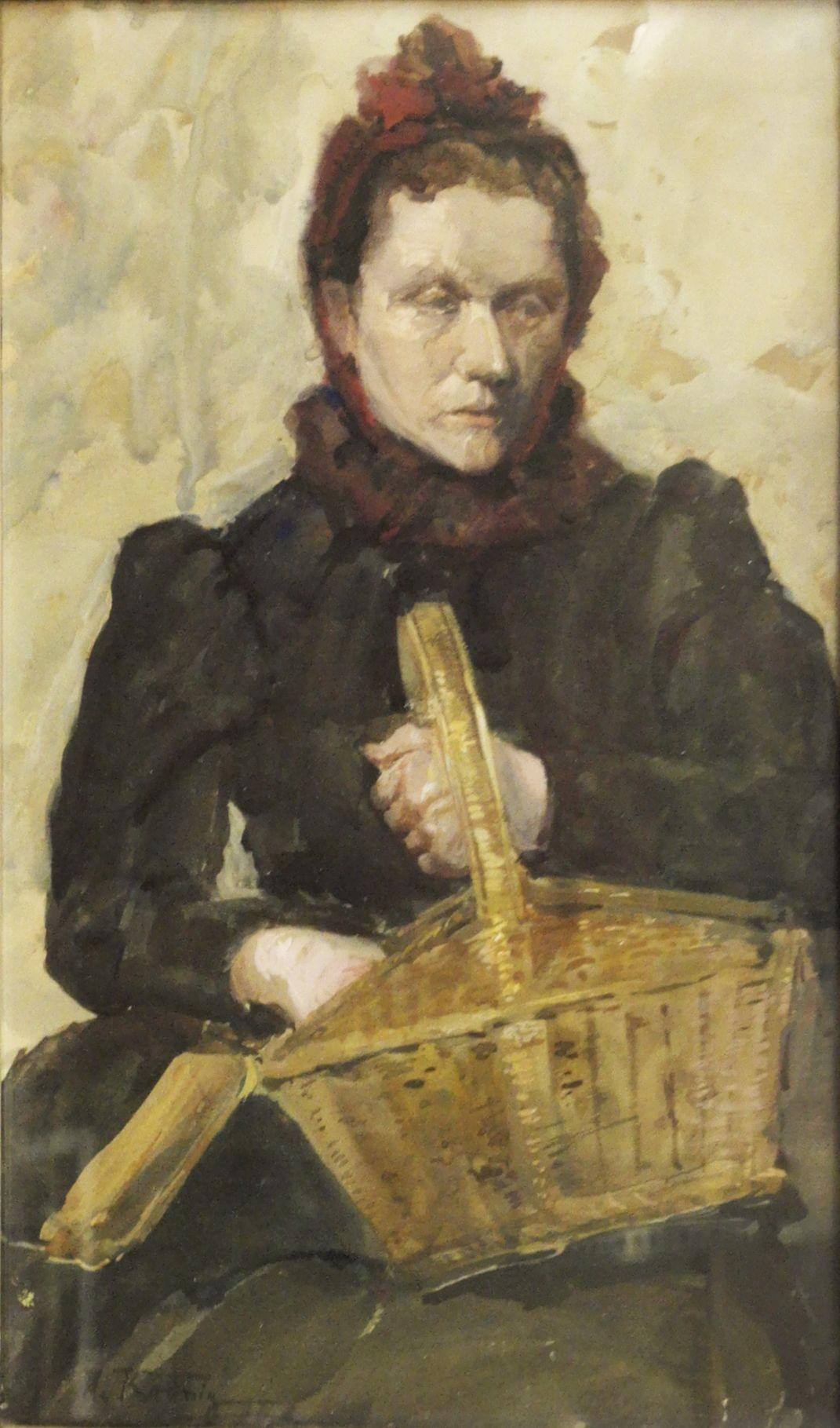 Paysanne au panier, gouache sur papier, signée, 30x18 cm
