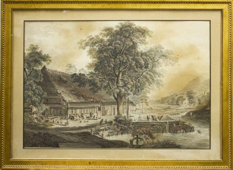 Ferme bernoise, gravure aquarellée, 37x50 cm