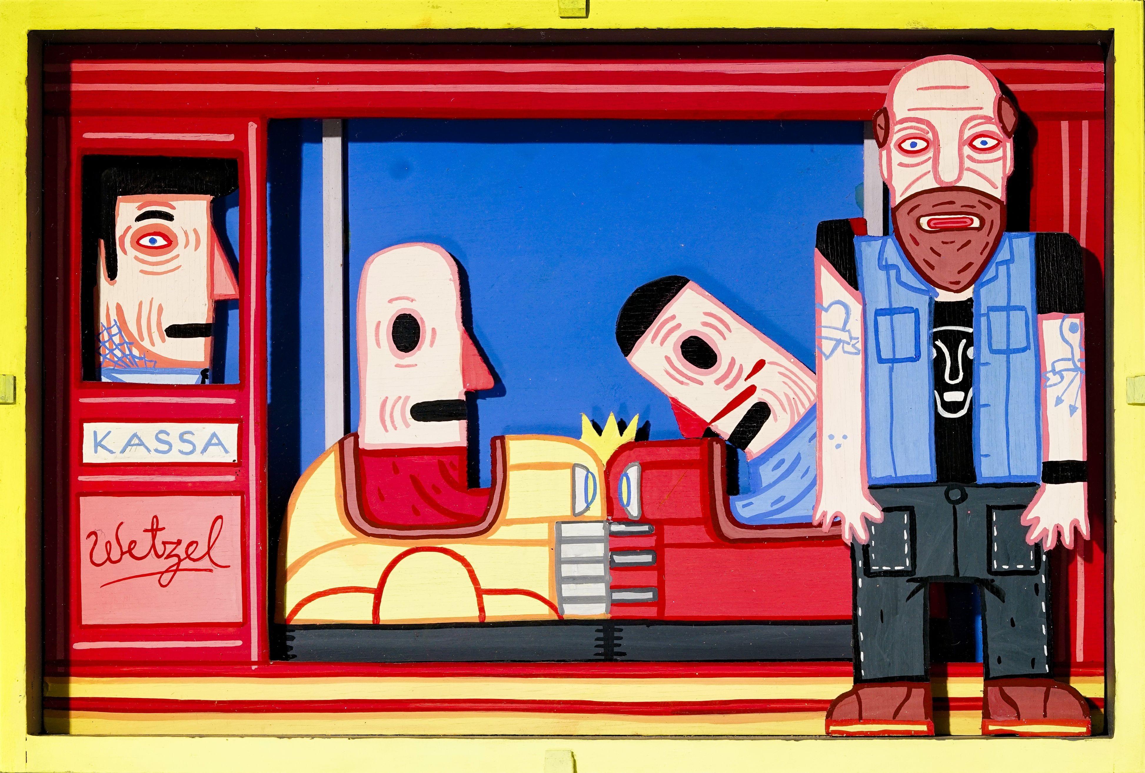 Auto-tamponneuse, maquette en bois sculpté, 20x30 cm Provenance : Galerie Papier Gras lors d'une exposition de l'artiste en 1999.