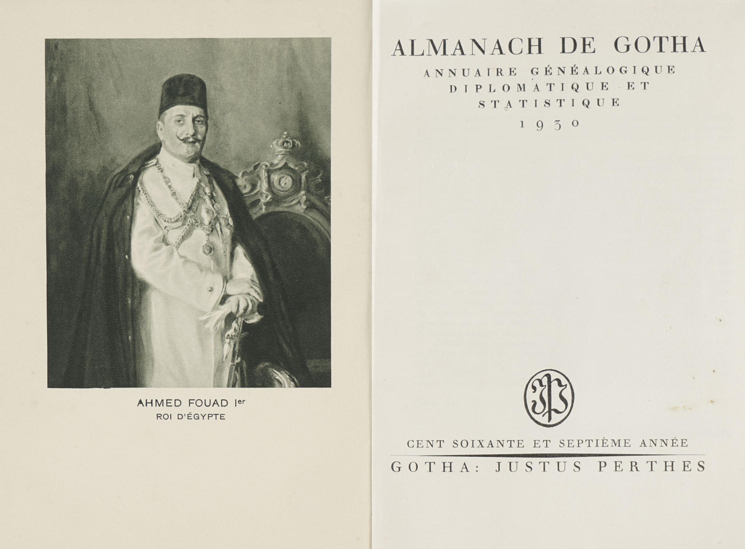 In-12, percaline rouge illustrée de l’éditeur. On joint quatre Almanachs de Gotha, années 1846, 1880, 1930 et 1943 (les reliures des deux premiers volumes sont accidentées).
