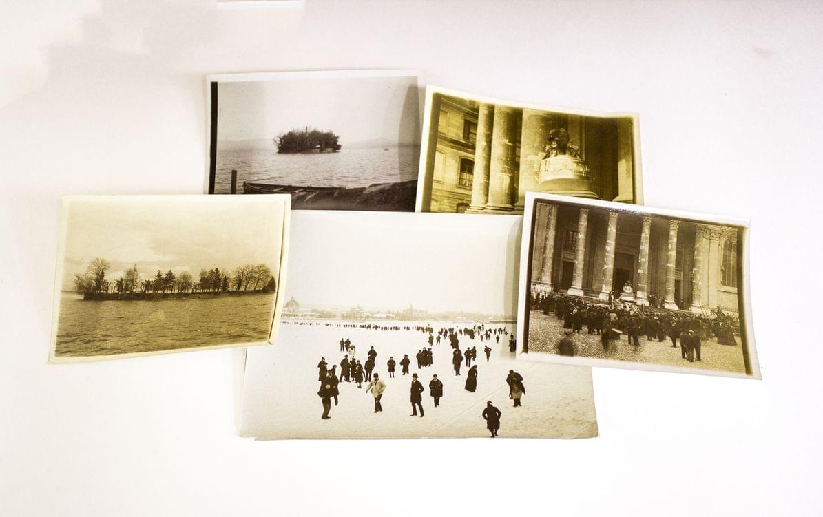 La rade gelée en janvier 1891, l'inauguration de la cloche La Clémence à Saint Pierre et l'île de la Harpe, suite de six épreuves d'époque, 12x16cm et 9x11,5 cm
