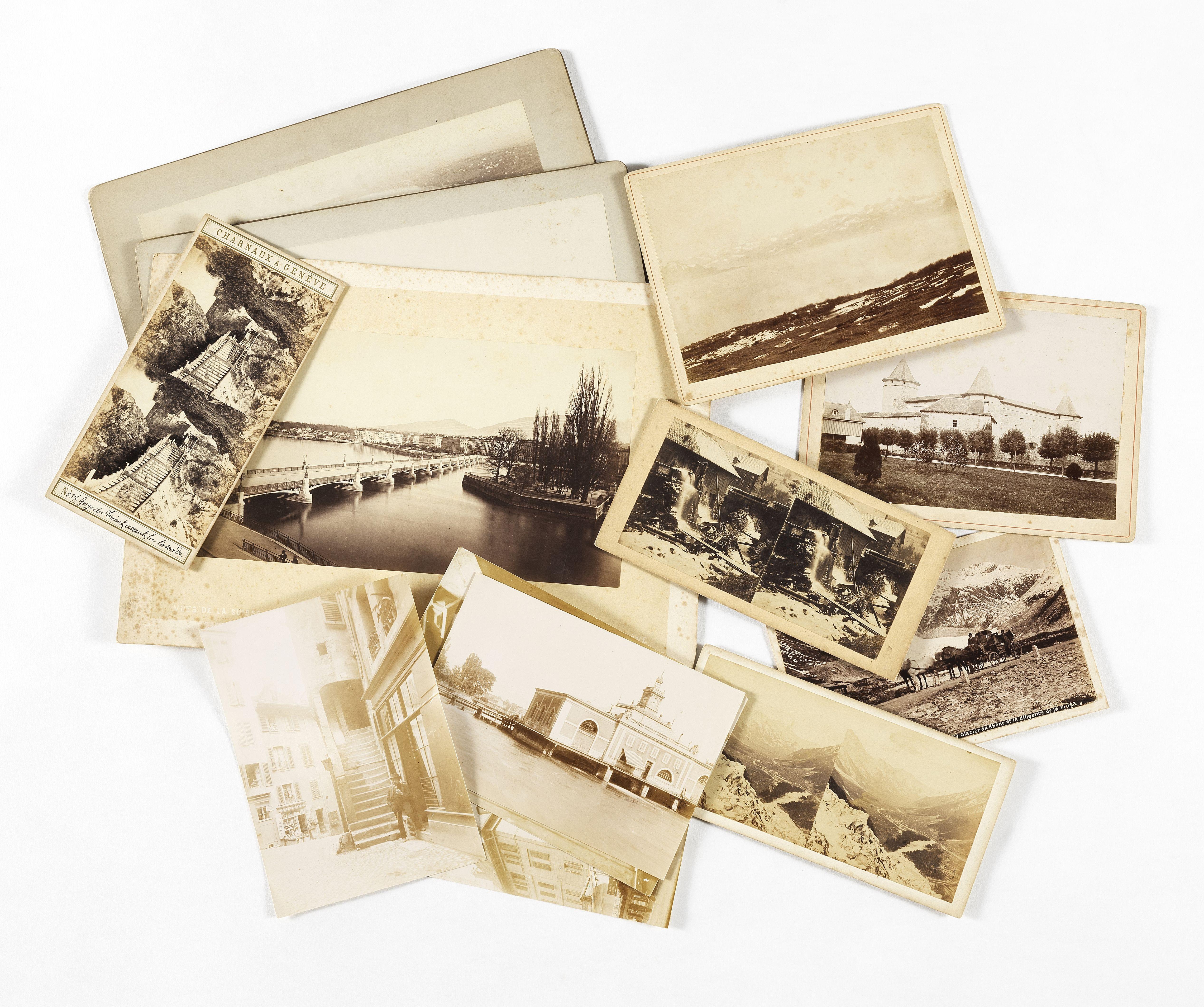 Lausanne, Vaud, dont Vufflens, Aigle, Sarraz, Romainmotiers, Diablerets, ensemble de tirages par GARCIN; Genève: intéressant ensemble de photographies de la ville fin XIXe s; Valais: nombreux tirages figurant des villages, vallées et glaciers dont certains par CHARNAUX, Francis FRITH, diligence de la Furka, innondations à Zug, etc...