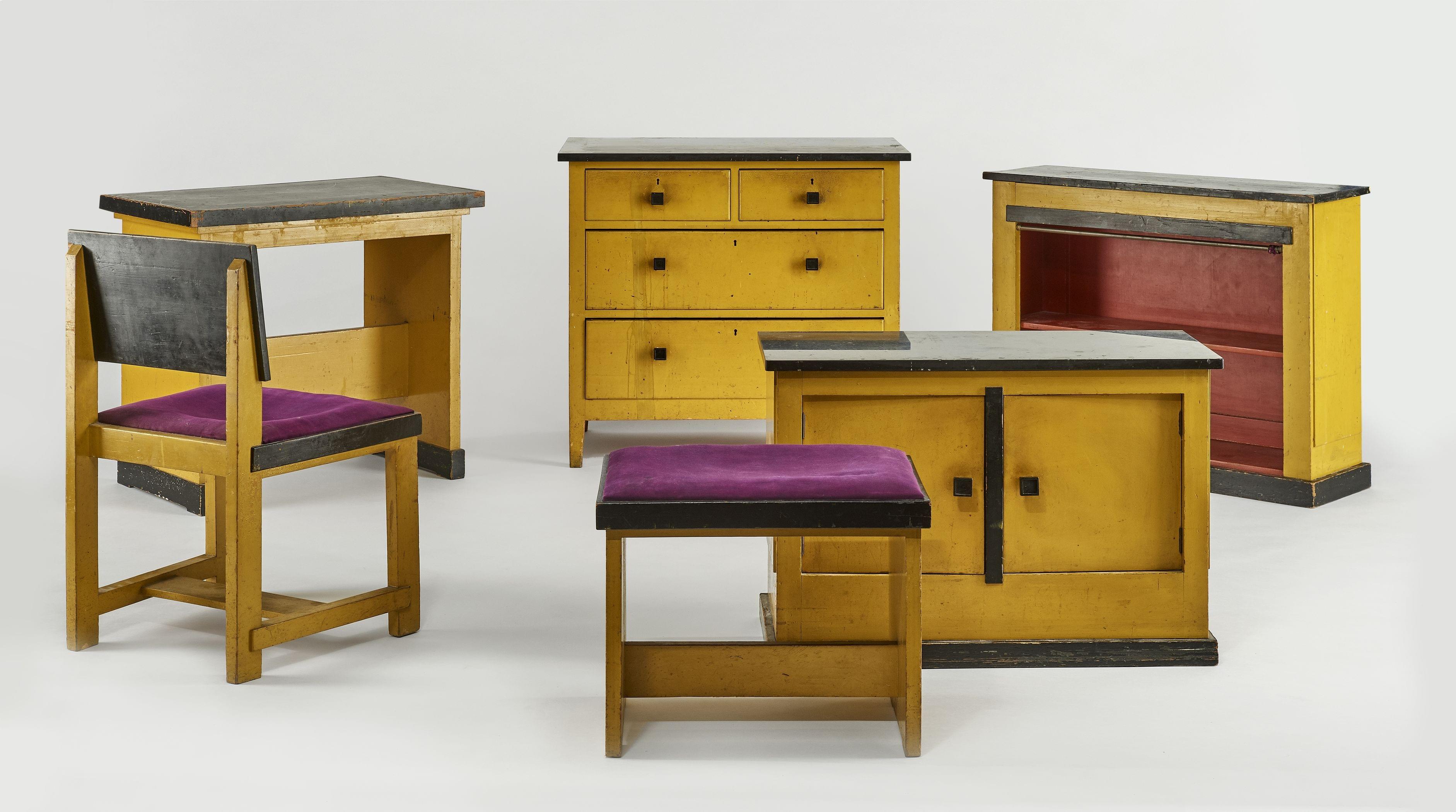 Ensemble moderniste, éditeur Pander & Zonen, comprenant: un bureau et sa chaise, une coiffeuse et sa banquette, une commode, un bibus et un chevet à deux vantaux, Pays-Bas, 1924, 78x85x53 cm. Bibliographie: notre ensemble reproduit p.12 dans l'ouvrage de Monique Teunissen & Albert Veldhuisen "Hendrik Wouda, architect en meubelontwerper"
