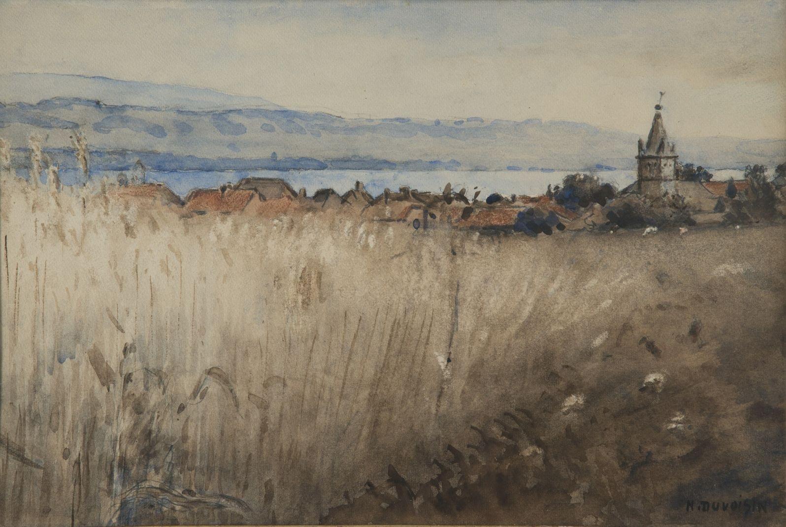 Champs de blé sur fond de lac, aquarelle signée, 31x46 cm