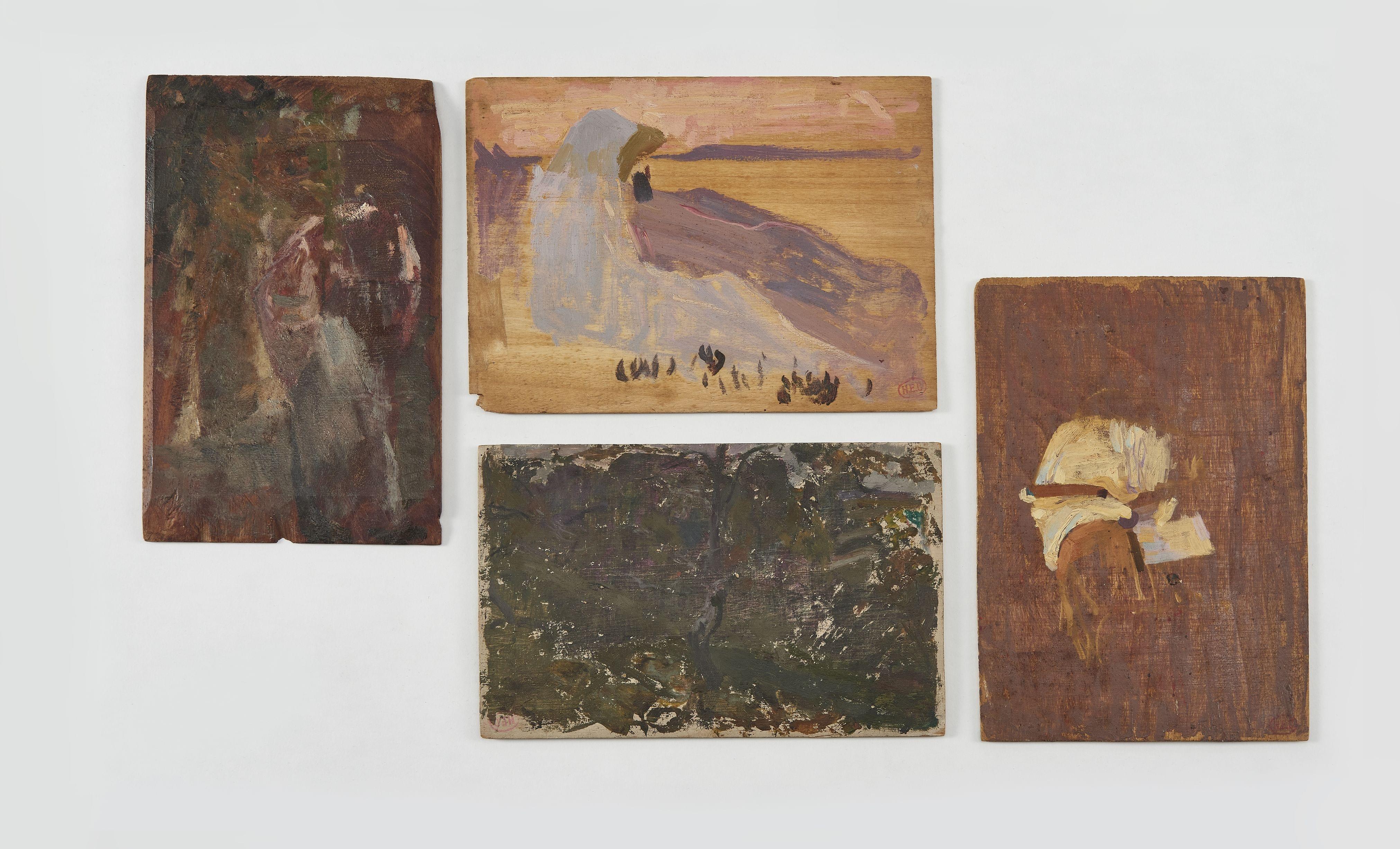 Ensemble de quatre études représentant deux paysages et deux personnages, huiles sur panneaux, portant le cachet d'atelier de l'artiste, H.E.C., de 14x22 à 16x22 cm. Nous remercions M. Patrick Offenstadt de nous avoir aimablement confirmé oralement l'authenticité du cachet.