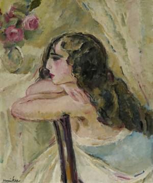 Jeune femme pensive, huile sur toile signée, 65x53 cm