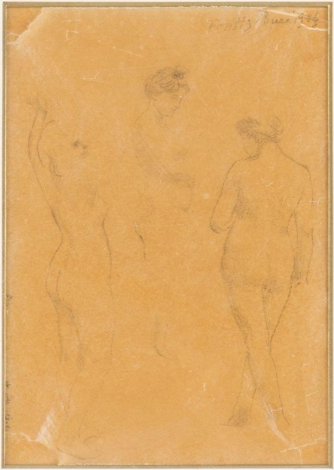 Trois silhouettes féminines, esquisse au crayon sur calque, 10x10,5 cm
