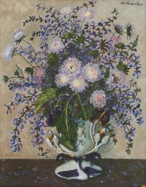 Bouquet de fleurs bleues, huile sur toile marouflée sur carton,...
