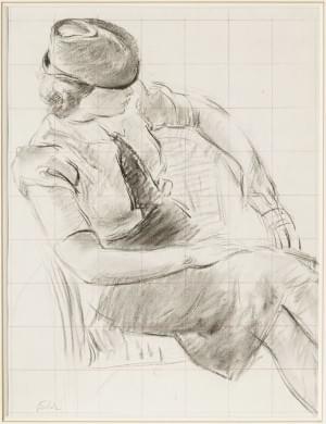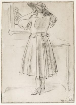 Jeune femme au miroir, fusain sur papier, signé, 23x32 cm