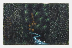 Paysage de rivière et flamants roses, huile sur toile, signée, 51x76 cm