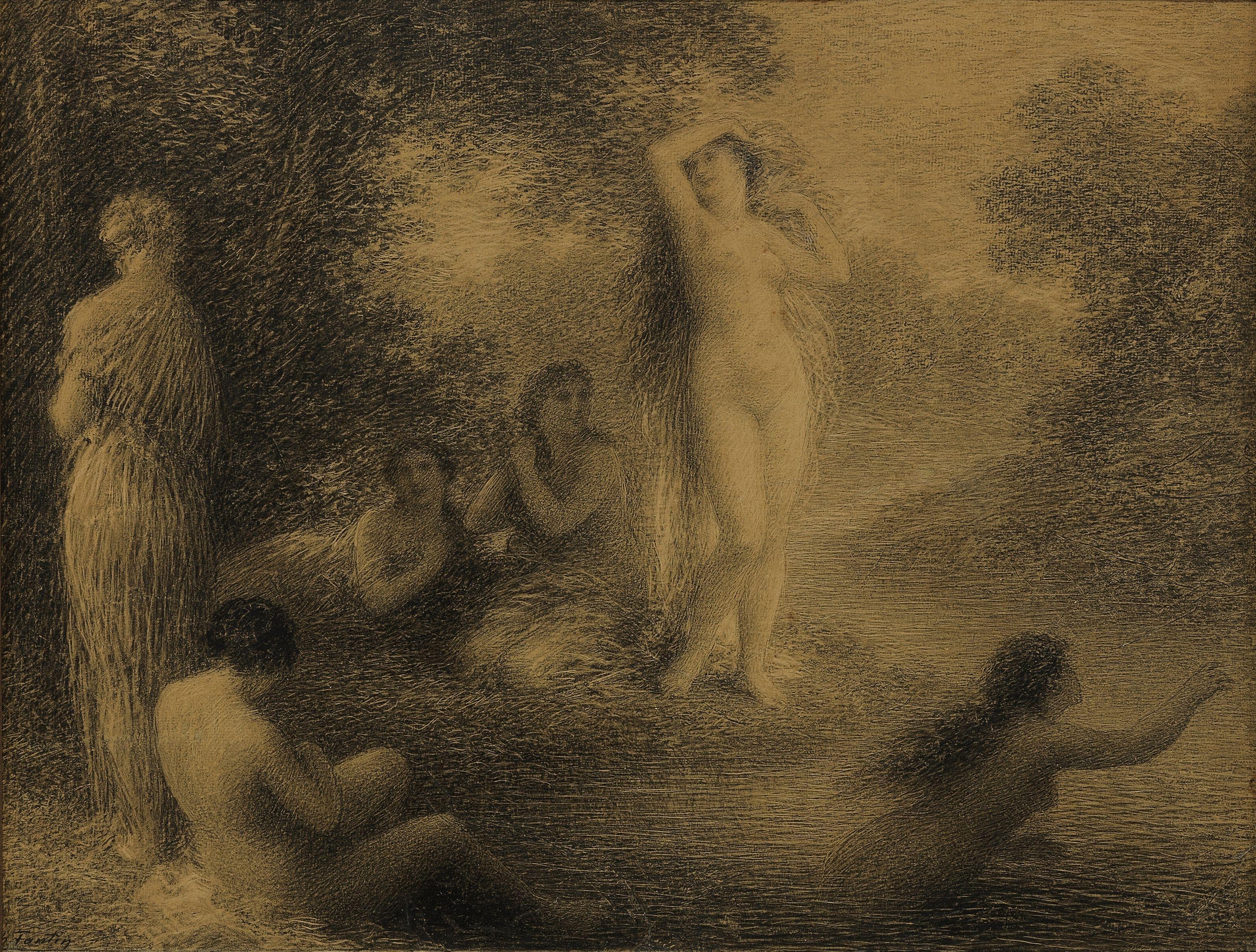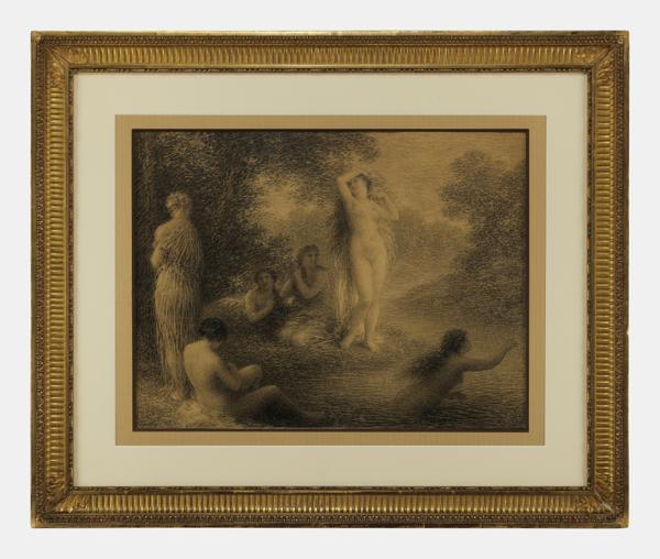 Baigneuses, pierre noire sur papier calque, grattage, signée, 52x36 cm