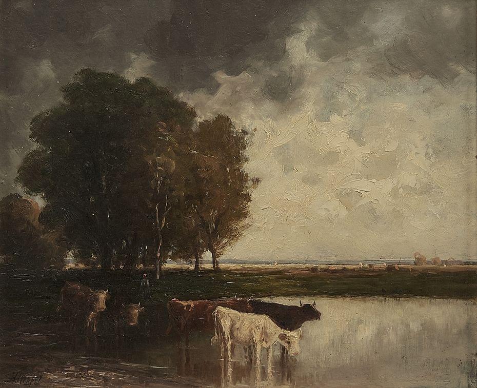 Vaches au bord de l'étang, huile sur carton, 23x28 cm