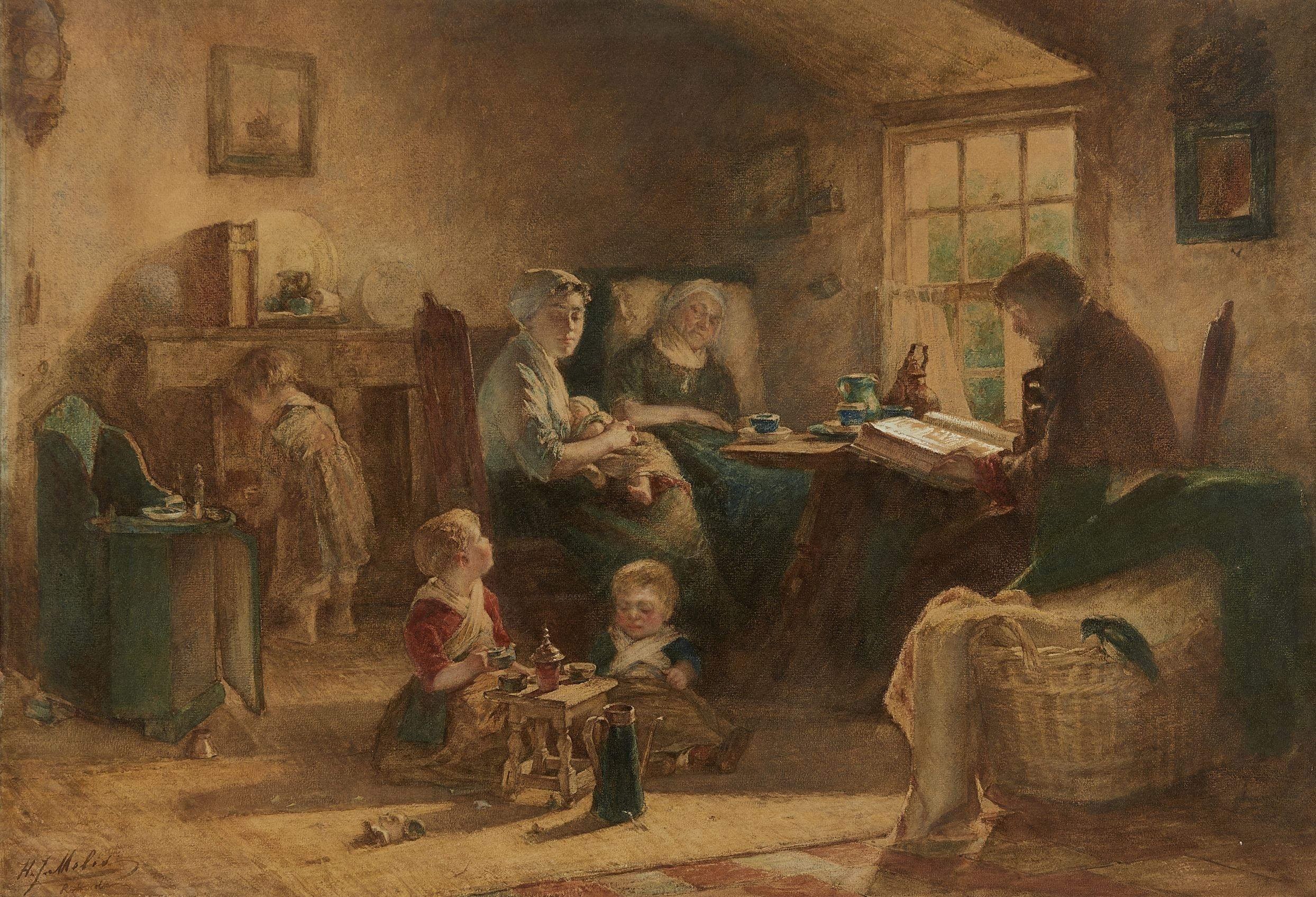 Famille paysanne dans un intérieur, aquarelle et gouache sur papier, 50x72 cm