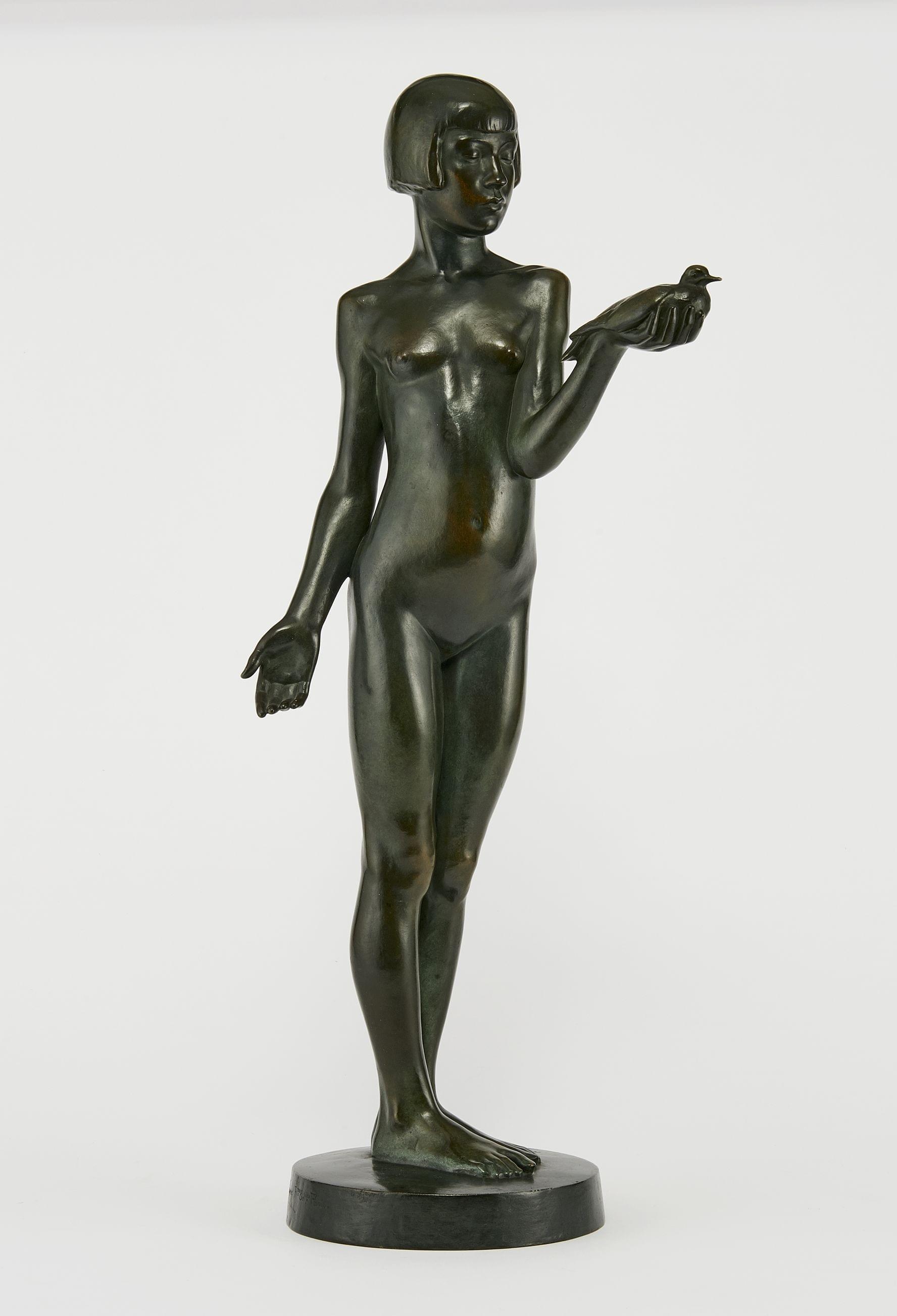 Première offrande dit aussi Fillette à la colombe (d’après Gisèle, fille de l’artiste), bronze à patine foncée, signé et cachet du fondeur Susse Frères à Paris et son tampon circulaire, H 62 cm. Grande version, le modèle conçu vers 1923, présenté au Salon des Tuileries, Paris, 1924.