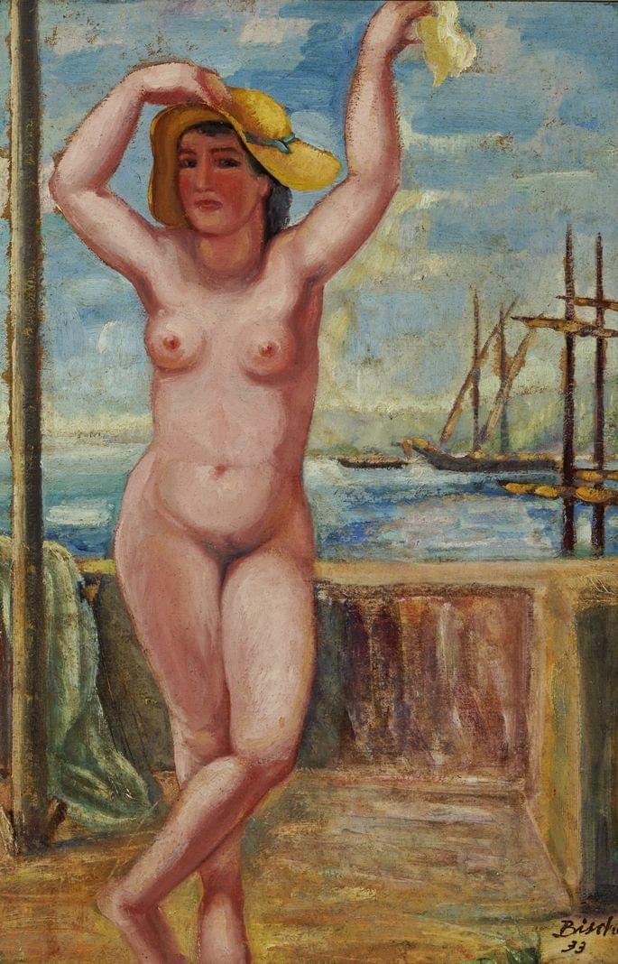 Naïade au drapeau, huile sur carton, signée et datée 1933, 39x25 cm