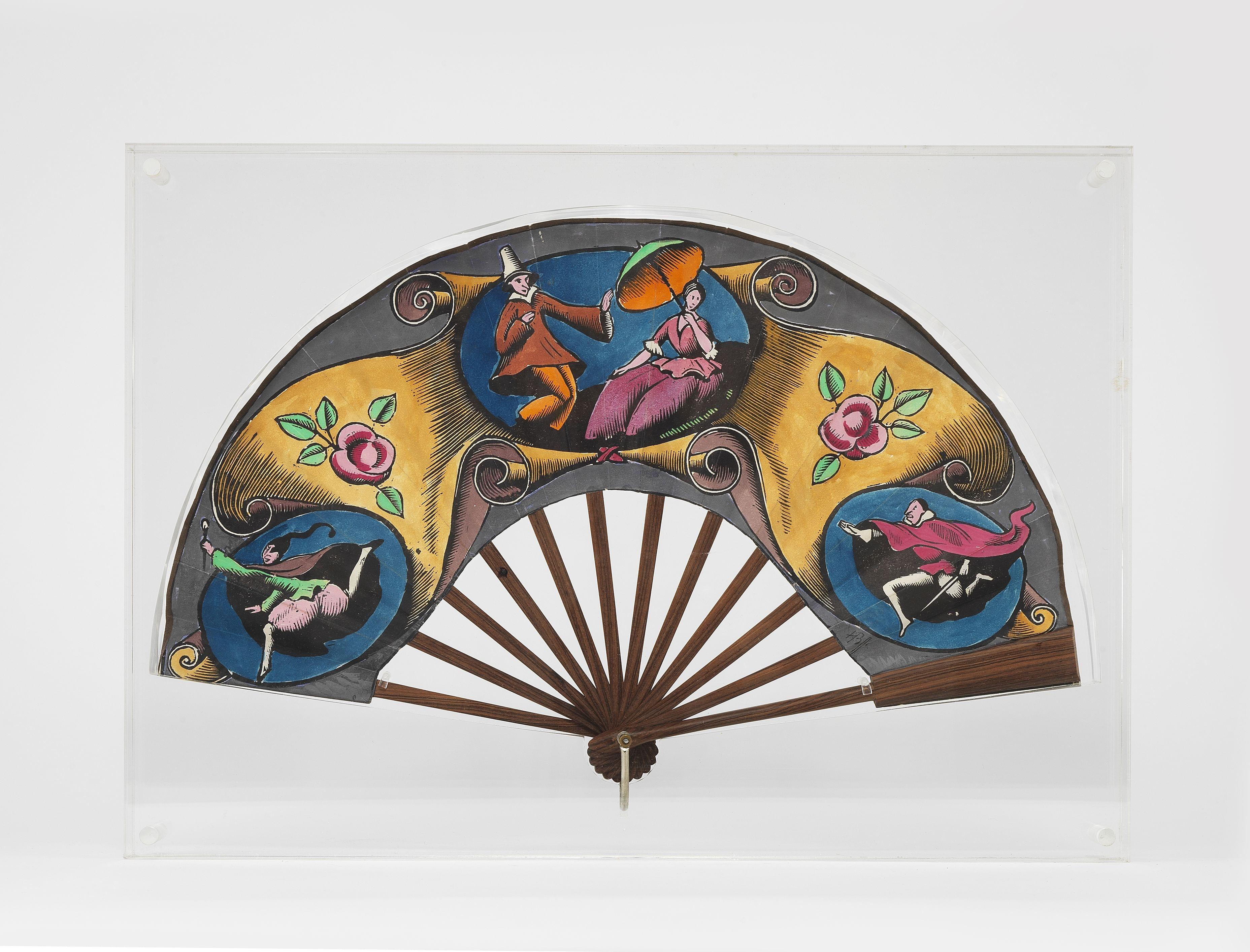 Eventail à décor peint de chinoiseries, aquarelle et gouache sur papier dans un coffret en plexiglass, monogrammé, 28x40 cm