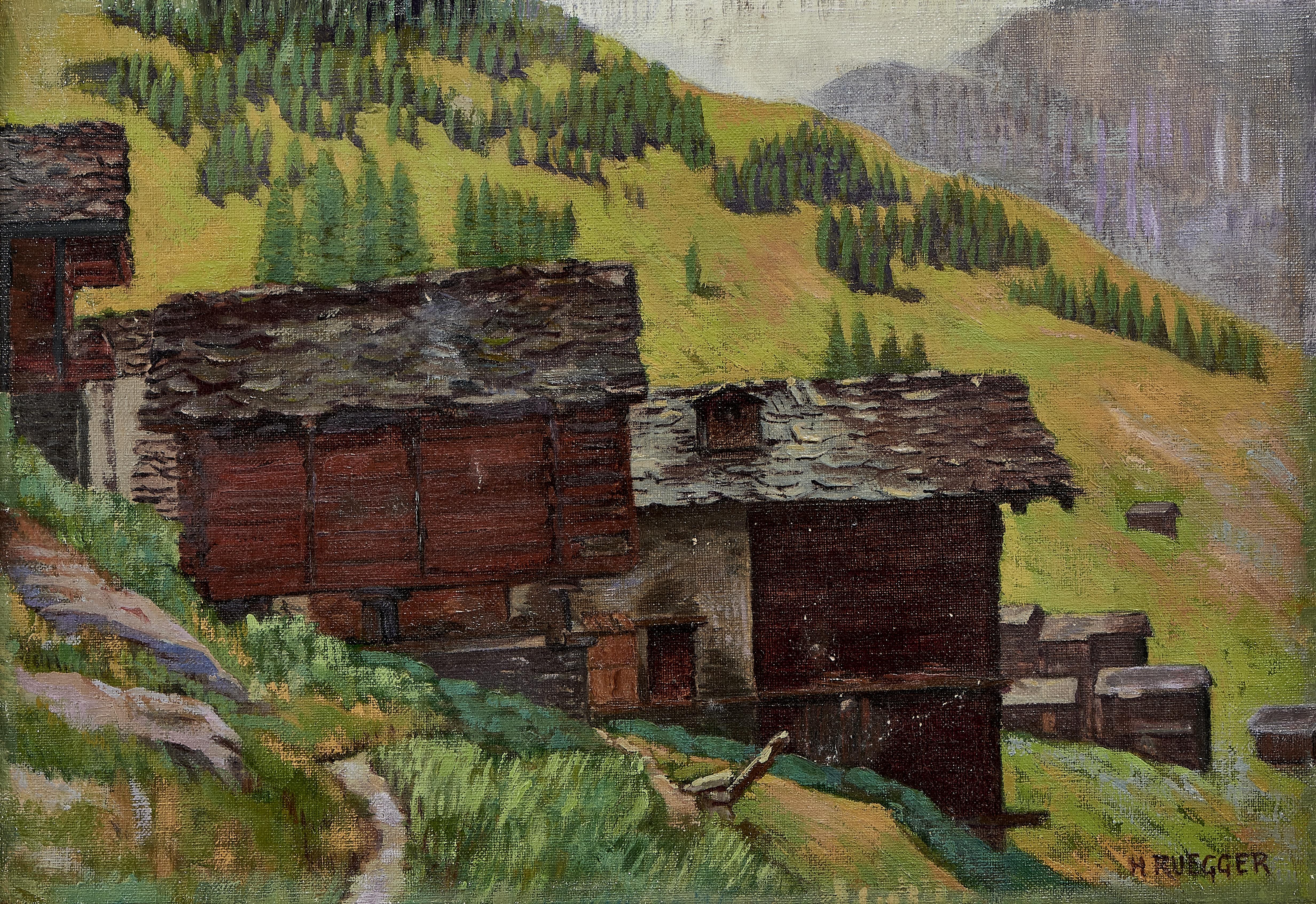 Mazots en Valais, huile sur toile, signée, 33x46 cm