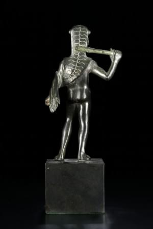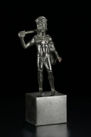 Bronze à patine vert foncé, H 15 cm. L'iconographie est respectée pour cet Herakles. Vêtu de la léonté qu'il porte depuis sa victoire sur le lion de Némée, il brandit sa massue. Manque très probablement un arc qu'il devait porter à la main gauche. Provenance: Collection privée suisse