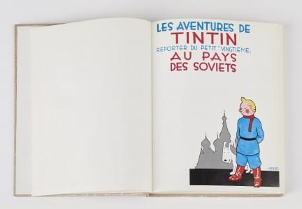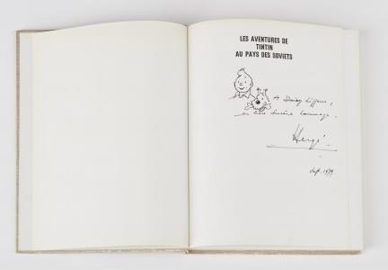 Les aventures de Tintin au pays des Soviets, édition studio Hergé 1969, numérotée 473/500. Album enrichi d'une dédicace et d'un dessin figurant Tintin et Milou à l'encre, datés 1979