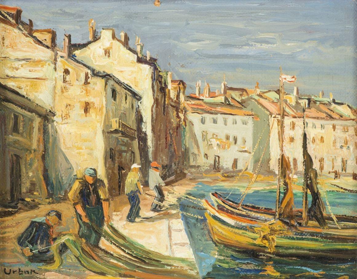 Retour de la pêche, huile sur carton, signée, 28x34,5 cm