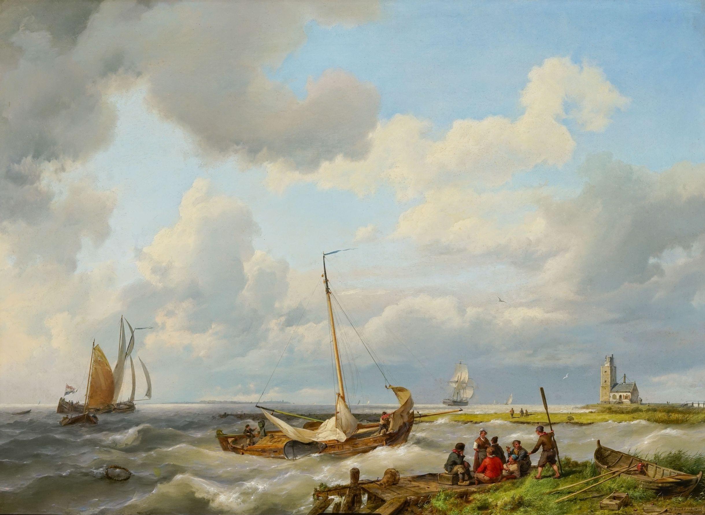 Barques dans un estuaire, huile sur toile, signée et datée 1853, 54x74 cm