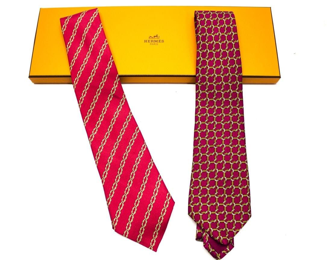 Lot de deux cravates en soie à décor géométrique sur fond rose et fuschia