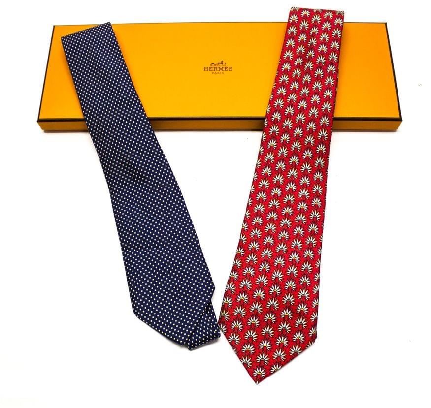 Lot de deux cravates en soie à fond rose à décor de fleurs et à fond bleu marine à décor de pois
