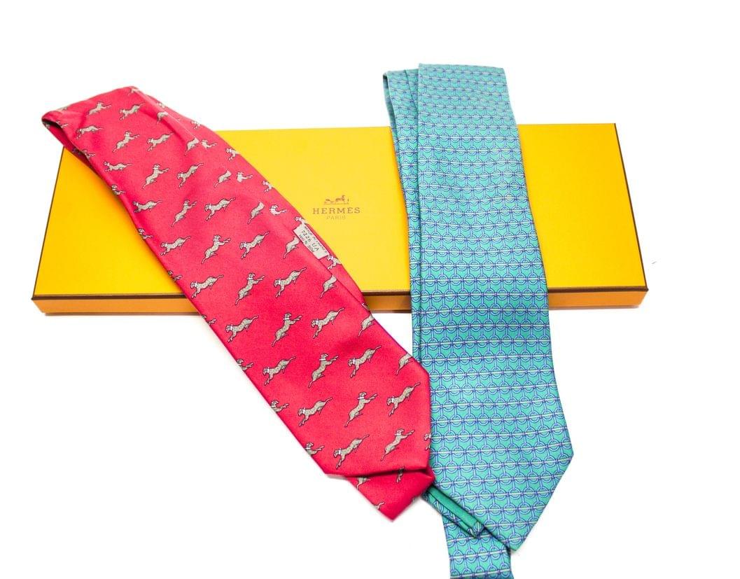 Lot de deux cravates en soie à fond rose à décor de chien et à fond vert à décor géométrique