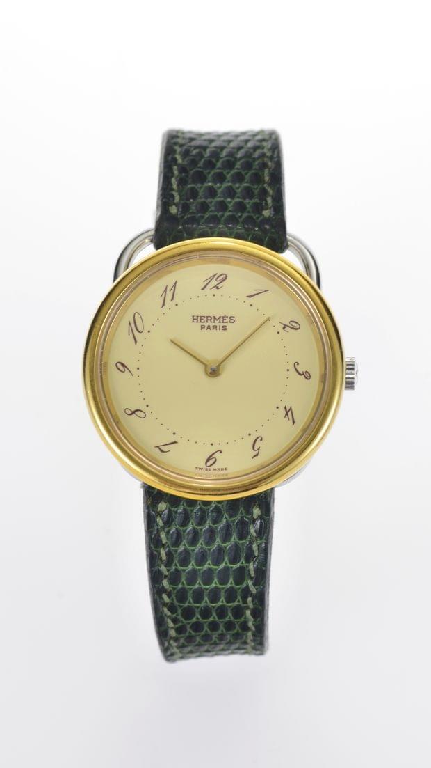 Cadran ivoire, chiffres arabes italique, aiguilles dorées, bracelet en cuir vert, acier et acier doré, D 29 mm