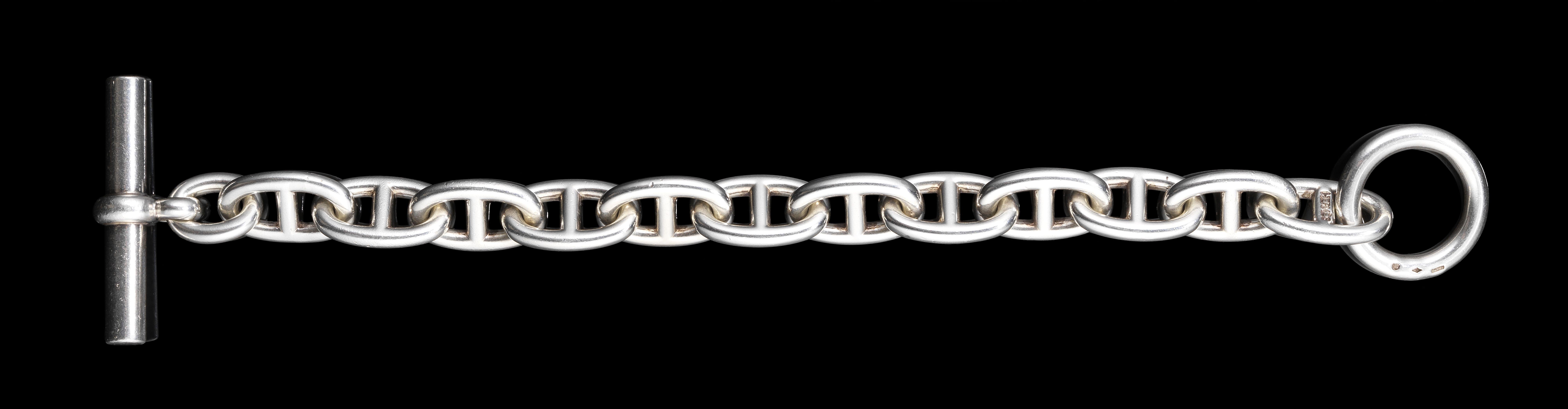 Cadran et aiguilles argentés, index bâtons noirs, date à guichet...