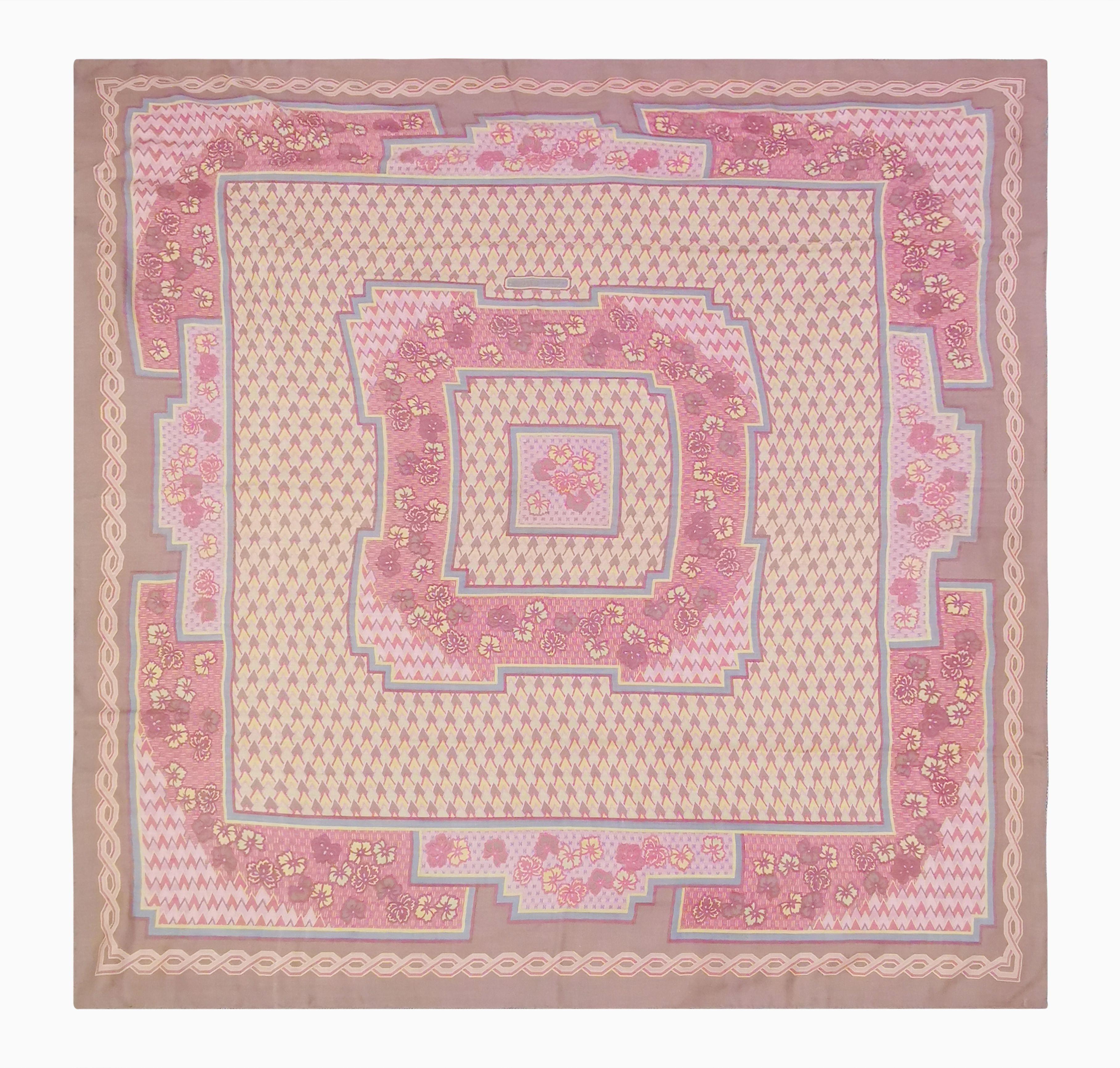 A décor de fleurs et formes géométriques sur fond jaune, bleu et bordure taupe, soie et cachemire, env. 130x130 cm