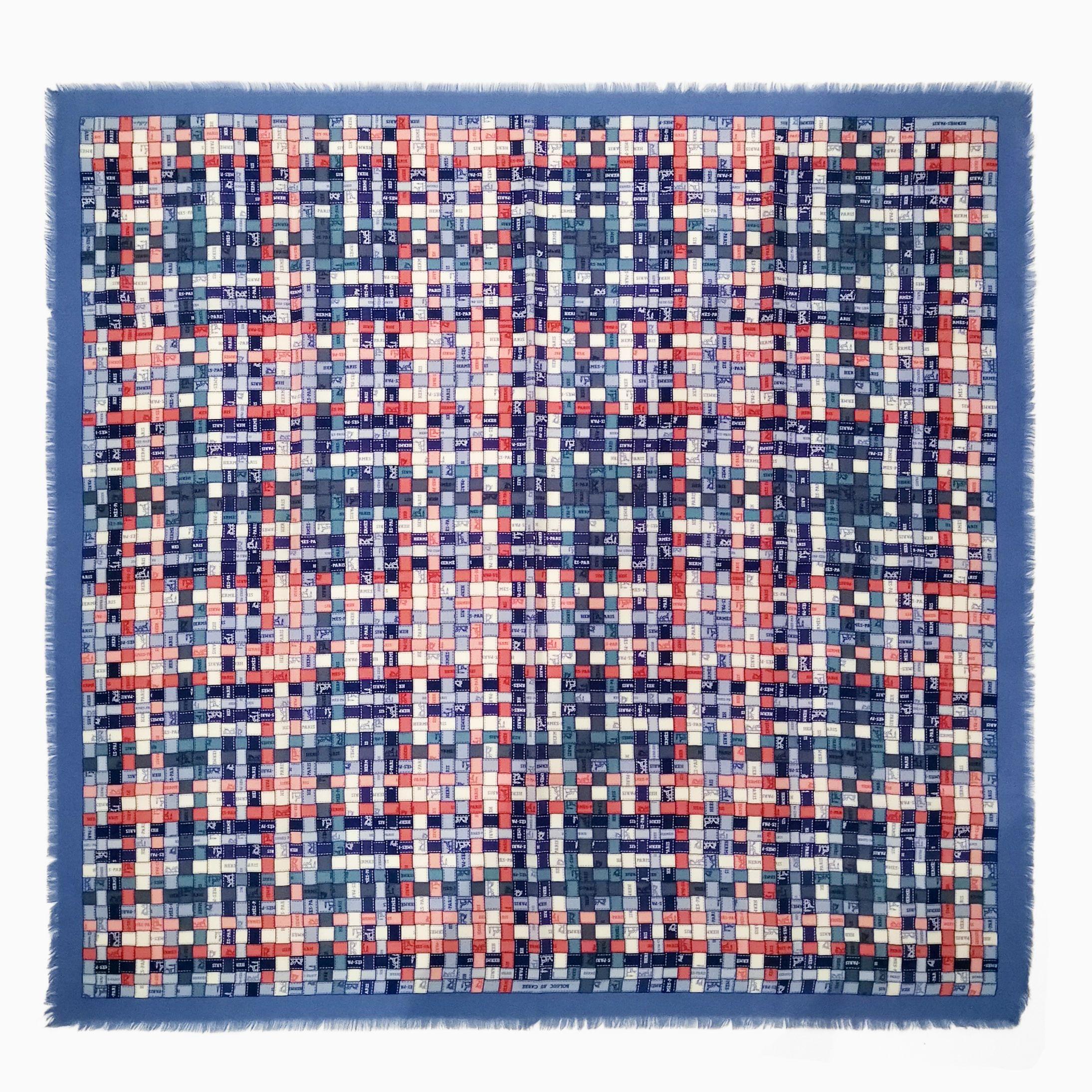 A décor de rubans multicolores formant un damier sur fond beige, rose, bleu et bordure bleue, cachemire et soie, 90x90 cm