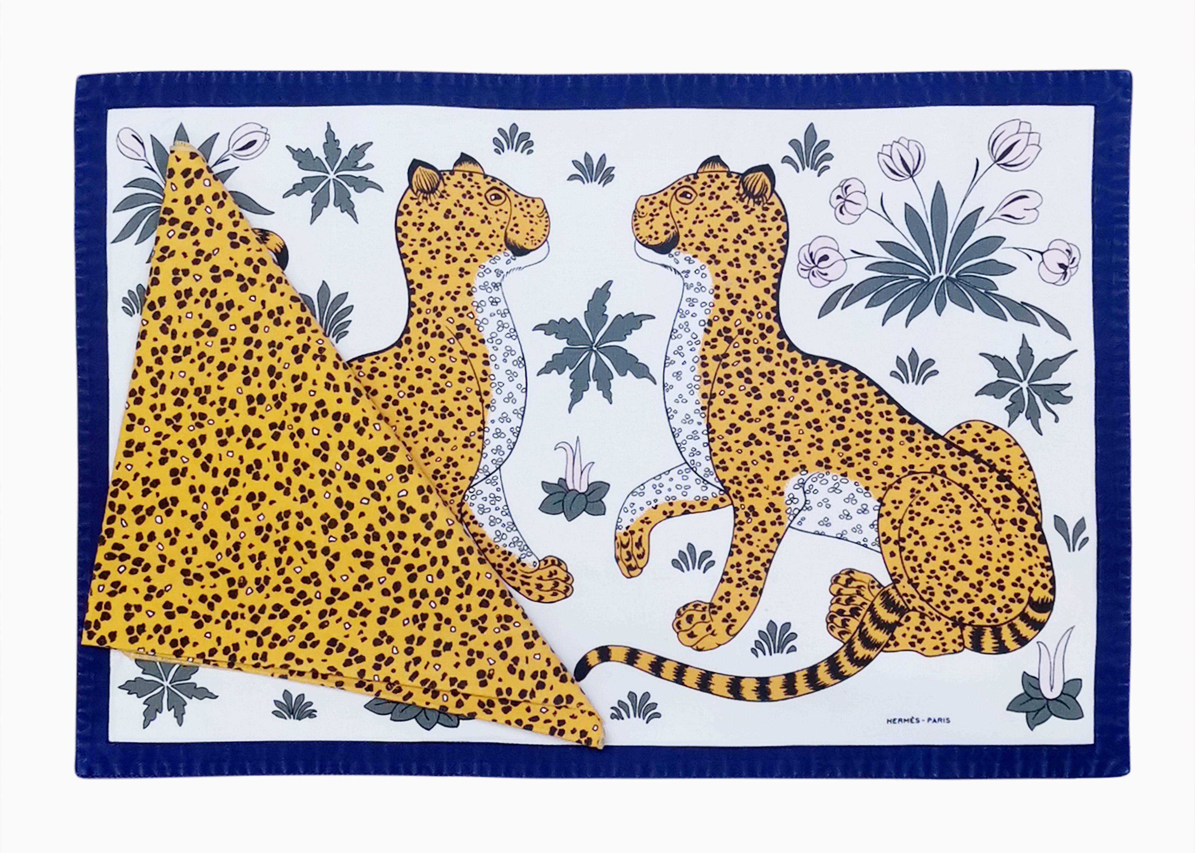 A motif de deux panthères sur fond blanc et bordure bleu marine ; serviette en imprimé panthère, coton imprimé, env. 33.5x45 cm et 46x46 cm