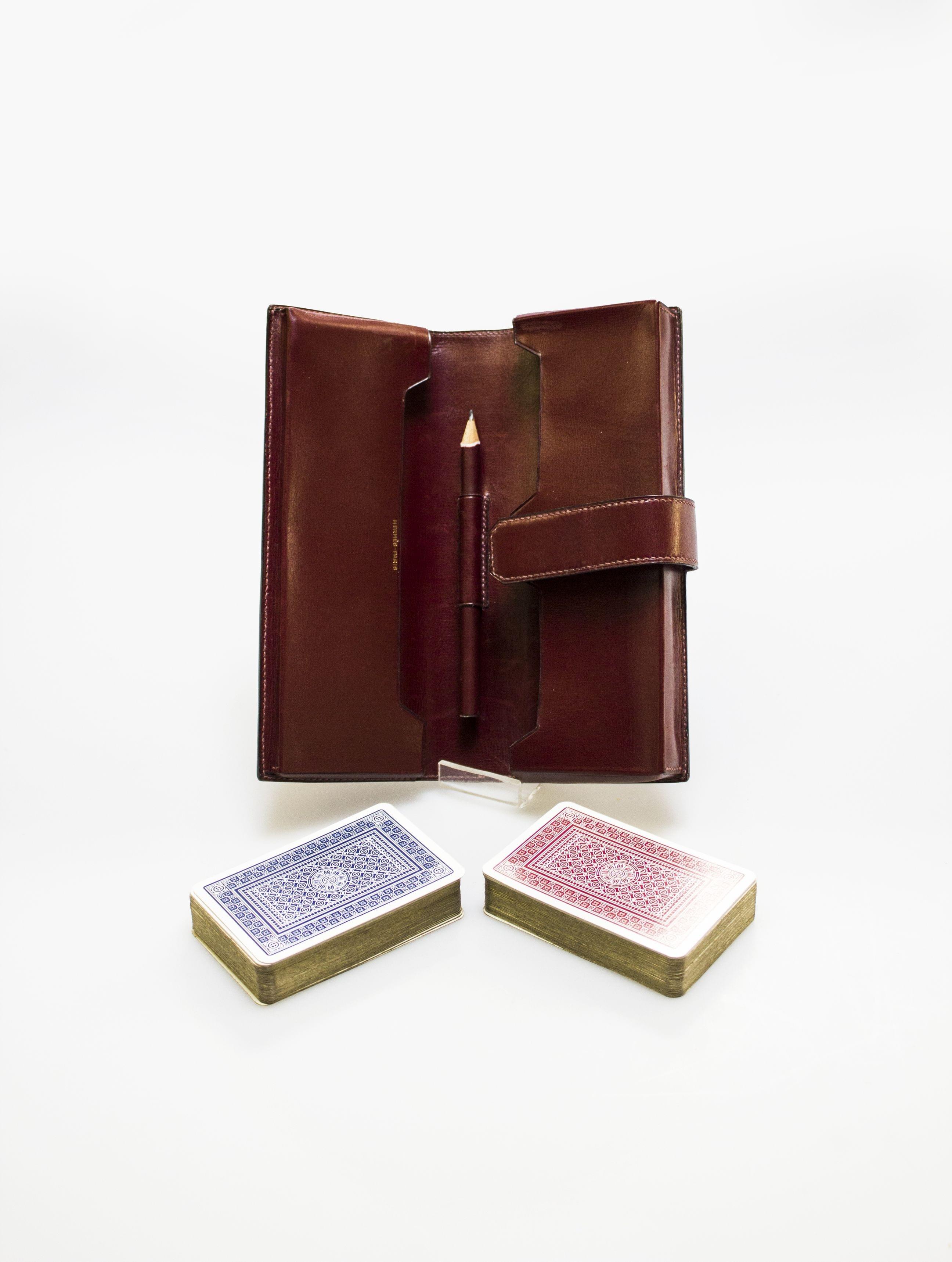 Cuir lisse bordeaux, deux jeux de 54 cartes, crayon à l'intérieur, 8x20 cm
