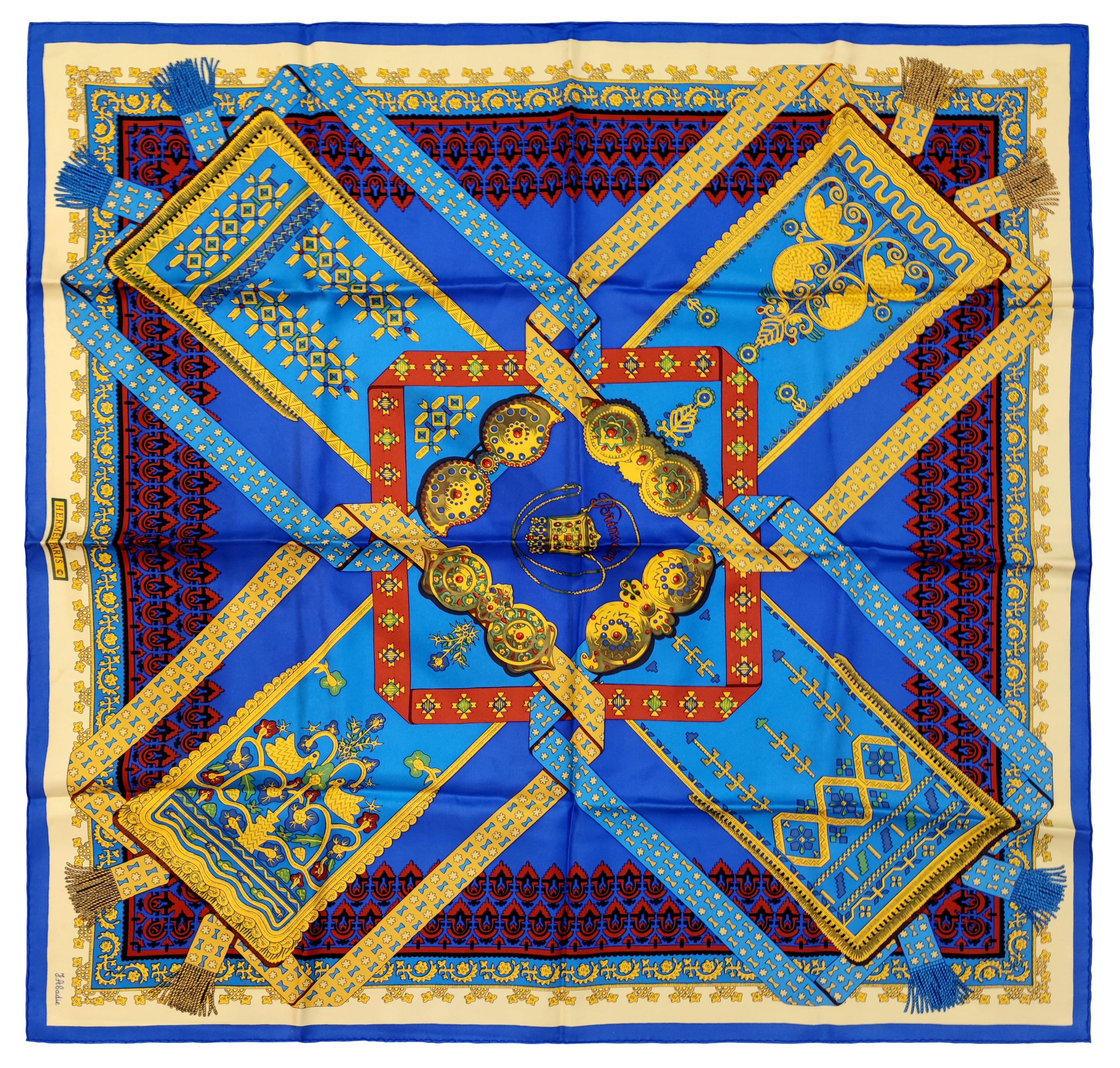 A décor de bijoux, rubans sur fond bleu, rouge et jaune, soie, 90x87 cm