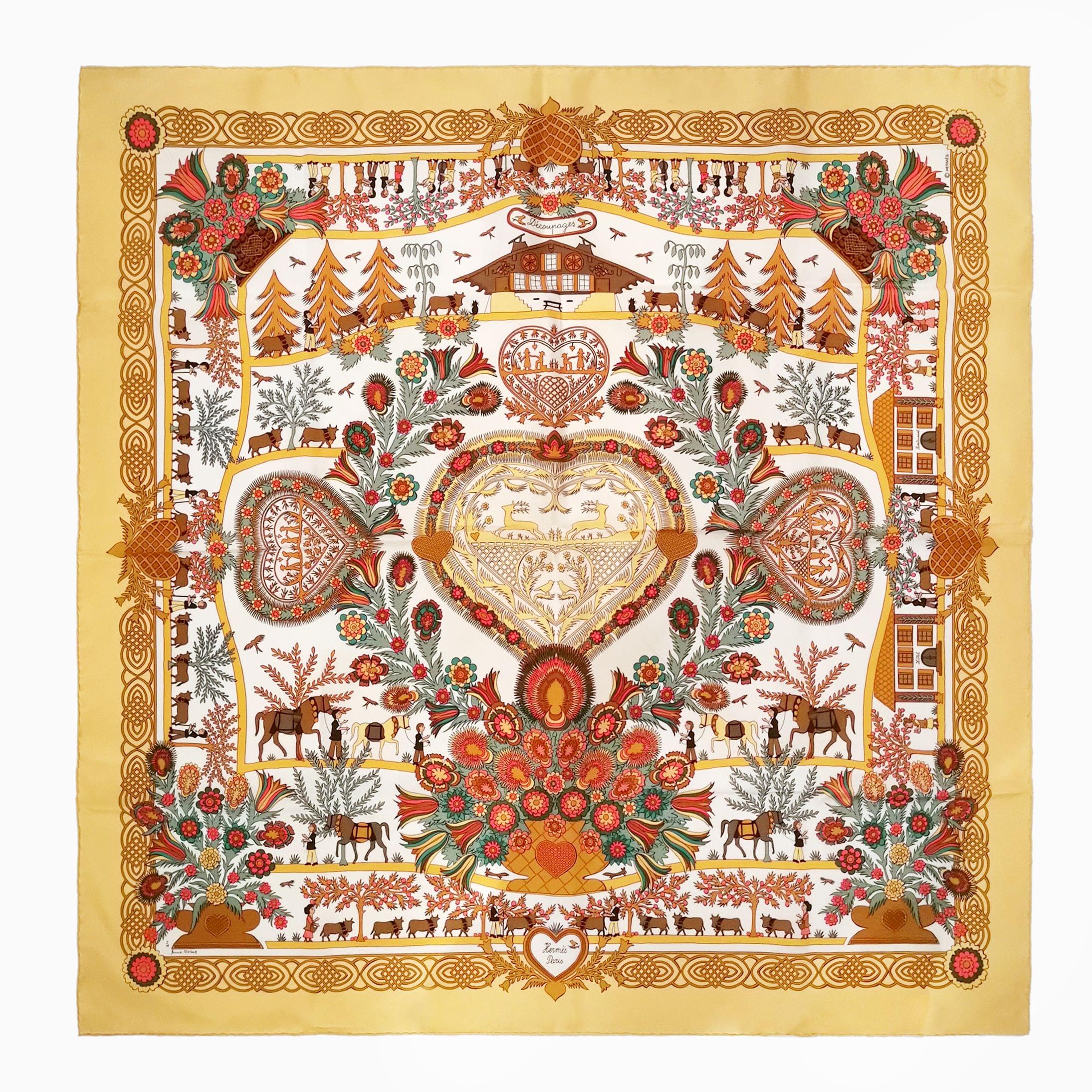 A décor de montée à l'alpage sur fond blanc, jaune et vert, bordure jaune, soie, 88x88 cm. Dans sa boîte