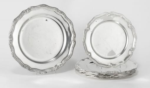 886. Suite de six assiettes de présentation à bordure festonnée ornée...
