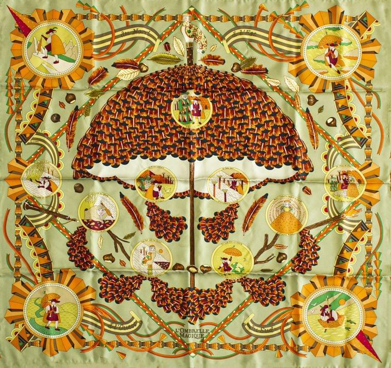 3030. Hermès, foulard "L'Ombrelle Magique" à fond vert et orange