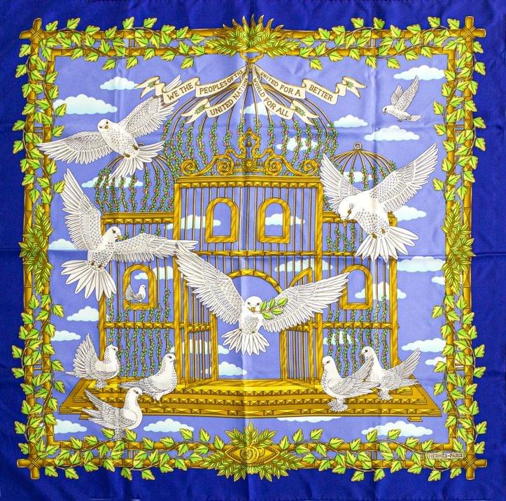 3031. Hermès, foulard "United Nations" à décor de colombes sortant de leur cage sur fond bleu foncé